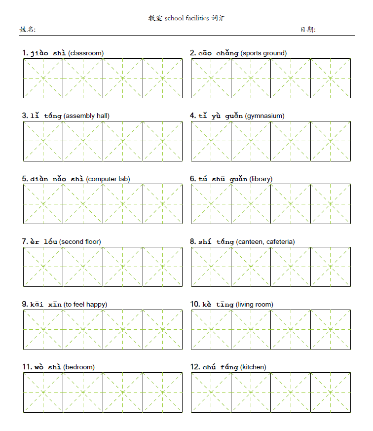 Writing from dictation allows your students to concentrate on the writing without having to compose original Chinese phrases or sentences. For each Chinese phrase, Pinyin and English meaning hints will be provided at the top of the writing line.